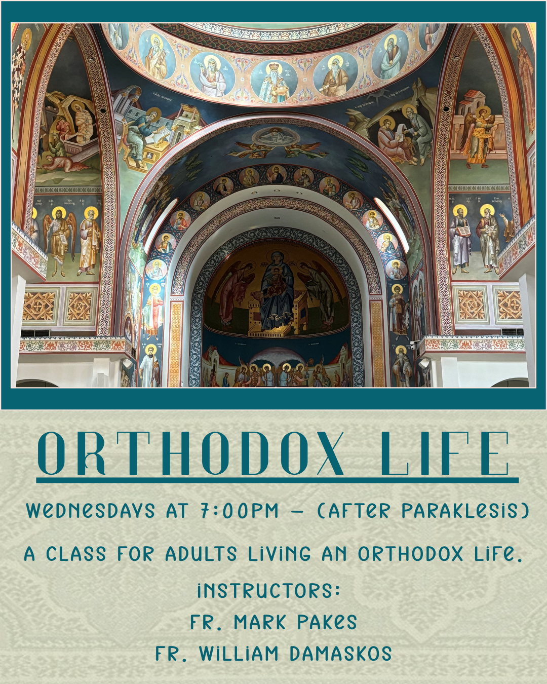 The Orthodox Life class meets at 7:00 PM on Wednesday evenings following Paraklesis, in the Board Room of the Sarris Community Center. We cover a variety of subjects related to the Orthodox Church. The class is open to all adults 18 and over, who wish to learn more and discuss our Orthodox Christian faith, our Church, our teachings and beliefs, plus our very rich history.